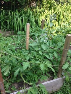 The first bed we came to have peppers growing, they were not doing as well as she had hoped, but the weather had been quite cool and rainy for this time of year; they are needing more sun and heat. The next two beds were filled with lush tomato plants; they were not flowering yet, also probably due to the cooler weather. Both the peppers and tomatoes are usually harvested late July and into August so there is still lots of time for them to start fruiting.
